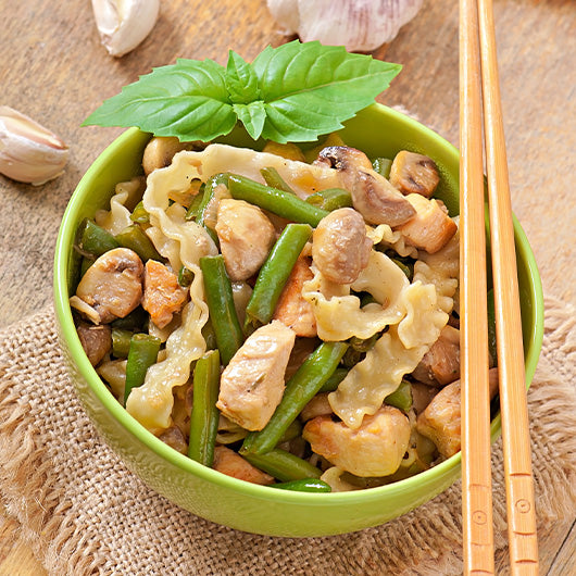 Stir-fried pork with beans and mushrooms